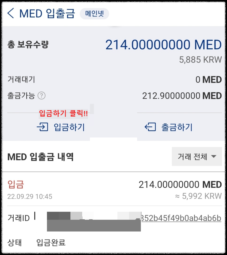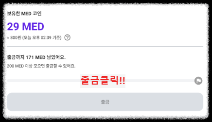 마지막으로 MED를 모았으면 현금화도 해보겠습니다. 메인 화면에 보시면 모은 MED가 보이실 겁니다. 거기를 클릭해주시면 됩니다.ㄱㄱ 그리고 아래 출금 버튼을 클릭하시면 보내실 코인 주소와 보내실 MED에 수량을 기입하고 보내면 끝입니다.