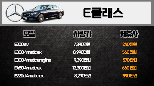E클래스는 벤츠에서 주력 모델이죠! 풀체인지 이후 할인이 거의 없었는데요. 이번달은 제휴사 프로모션 정말 좋습니다. 아마 이번달 최대 판매량이 나오지 않을까 예상해 봅니다. 트림별 차이는 있지만 최대 조건은 660만 원입니다.
