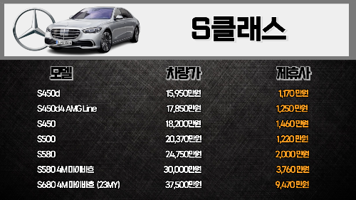 그리고 S클래스 모델은 법인 조건은 별도로 보셔야 합니다. 자세한 사항은 "자이언트카"로 문의해 보시면 해당시점 최대조건 안내받으실 수 있습니다.