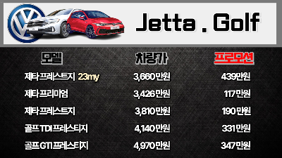 - 골프 GTI 프레스티지 (2024년): 차량 가격 4,970만 원, 최대 프로모션 347만 원.