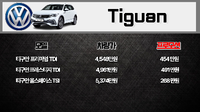- 티구안 프리미엄 TDI (2024년): 차량 가격 4,548만 원, 최대 프로모션 454만 원