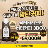 전문 바리스타가 선택한 풍부한 원두의 바디감을 가진 닥터 바리스타! 57% 닥터 바리스타는 전 세계 원두 중 산미와 바디감이 가장 방탄 커피와 어울리는 콜롬비아와 브라질의 OOOO OO를 직접 로스팅&블랜딩을 해서 만들었는데요. 000000은 무엇일까요?