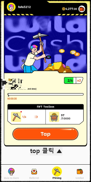 마이닝 탭에 들어가셔서 탭 버튼만 눌러주시면 포인트를 채굴하실 수가 있습니다. 하루 채굴량은 10,000포인트 정도 되고 장기 업그레이드를 하시면 더 많은 채굴이 가능합니다. 업그레이드는 별도로 구매하시는 것이 아니라 채굴한 포인트를 활용하시면 되겠습니다. " 단 하루에 한 번 업그레이드 가능 "