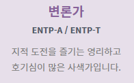 해외에도 많은 유형이 있으며 특히 미국 벤처기업에서 선호하는 MBTI입니다.
